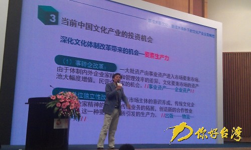 文化產業(yè)被稱為是“二十一世界的黃金產業(yè)、朝陽產業(yè)”,是當今最熱門的議題,已成為海峽兩岸共同焦點。參加論壇的嘉賓從各自的領域發(fā)表見解。劉玉珠司長回顧了兩岸文化交流的過程,強調兩岸文化一定要加強交流,深化交流,前景十分廣闊。武漢大學文化創(chuàng)新研究中心主任傅才武為大家分析了當前中國文化產業(yè)的投資機會有哪些?臺灣亞太文化創(chuàng)意產業(yè)協(xié)會發(fā)起人兼理事長陳立恒先生與大家分享他在文化產業(yè)如何認識文化、怎樣樹立品牌的成功經驗。