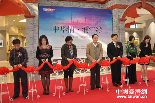 首屆“中華情、浦江緣――‘精 美’滬臺(tái)書(shū)畫(huà)插花藝術(shù)展”在上海開(kāi)幕,兩岸嘉賓為藝術(shù)展開(kāi)幕剪彩。(上海市臺(tái)協(xié) 玉龍 攝)