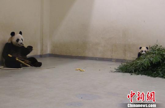 圖為“圓仔”咬竹葉,媽媽“圓圓”在吃晚餐!∨_北市立動物園供圖 攝