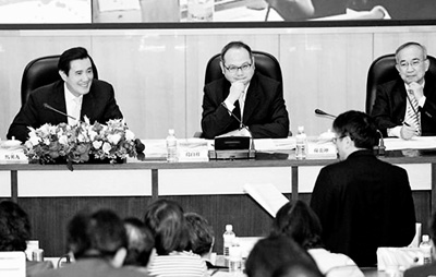 見圖:馬英九(左)參加2014年度臺灣大專校院校長會議時表示,臺灣開放大陸學(xué)生赴臺念大學(xué),整體成效“利大于弊”。