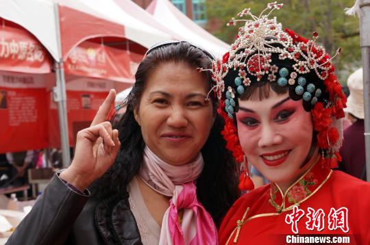 2月20日,在臺中市舉辦的第五屆海峽兩岸春節(jié)民俗廟會上,臺灣戲迷追到幕后與豫劇名角魏俊英合影留念。 李貴剛 攝