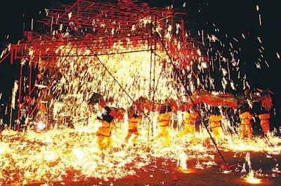 2月17日,確山縣民間藝人手舞龍燈穿梭在飛濺的鐵花之中,迎接農(nóng)歷羊年的到來。確山鐵花曾一度瀕危,上世紀七八十年代,經(jīng)過當?shù)匚幕ぷ髡邠尵刃酝诰,使之成為全國第二批非物質(zhì)文化遺產(chǎn)項目。李璞 攝