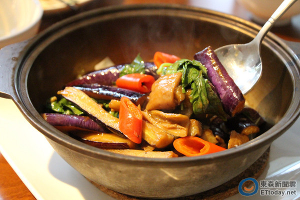 富錦樹臺菜香檳的塔香茄腸煲。(圖/黃士原攝)