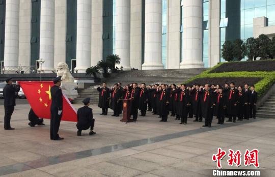 圖為福建省高級人民法院的新任審判人員面對國旗向憲法莊嚴宣誓!×至帷z
