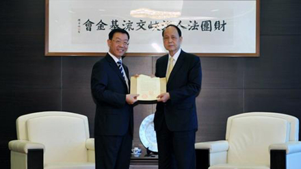 圖為海基會董事長林中森代表臺灣接受捐款。