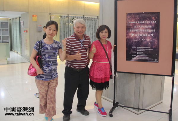 臺北觀眾陳先生、鐘女士(右)與楊小姐(左)散場后在演出海報前拍照留影,要把照片發(fā)上臉譜網(facebook),將北京學子送來的精彩和感動傳遞給更多臺灣民眾。(中國臺灣網 王思羽 攝)