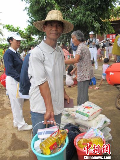 圖為海南省臨高縣臨城鎮(zhèn)大波村委會豪堯村村民領(lǐng)取救災物資現(xiàn)場。 付美斌 攝
