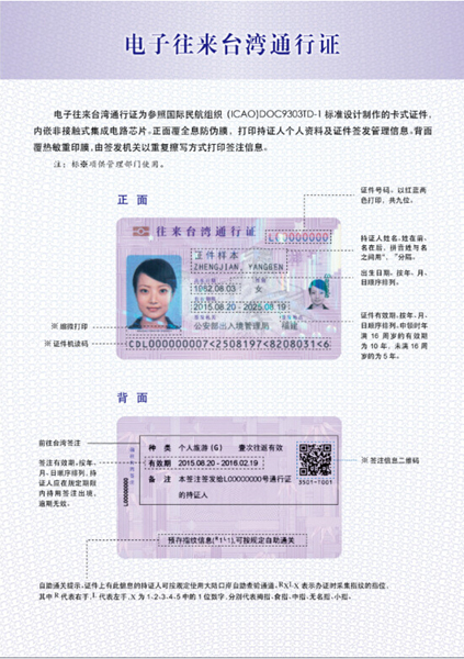 據(jù)了解,電子往來(lái)臺(tái)灣通行證為參照有關(guān)國(guó)際標(biāo)準(zhǔn)設(shè)計(jì)制作的卡式證件,內(nèi)嵌非接觸式集成電路芯片。前往臺(tái)灣簽注不再采取貼紙的方式,而是直接打印在證件背面,并可重復(fù)擦寫(xiě)。成人電子往來(lái)臺(tái)灣通行證有效期延長(zhǎng)為10年,對(duì)未滿16周歲的仍簽發(fā)5年有效通行證。根據(jù)《中華人民共和國(guó)出境入境管理法》有關(guān)規(guī)定,經(jīng)國(guó)務(wù)院批準(zhǔn),申領(lǐng)電子往來(lái)臺(tái)灣通行證應(yīng)當(dāng)按規(guī)定留存持證人指紋信息。已留存指紋信息的持證人出入境時(shí),可以按規(guī)定自助通關(guān)。