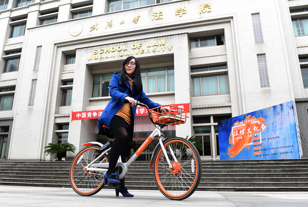 在武漢大學(xué),林柔婷騎車(chē)來(lái)到武漢大學(xué)法學(xué)院。(新華社記者 程敏 攝)