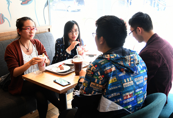 5月2日,林柔婷(左二)和朋友在武漢大學(xué)校園里的咖啡館聊天。(新華社記者 程敏 攝)