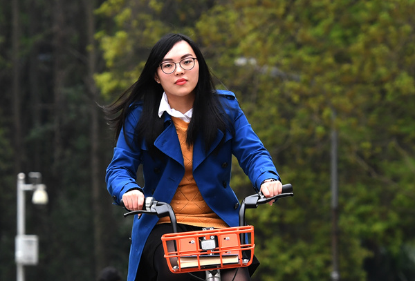 林柔婷在武漢大學(xué)校園里騎車(chē)。(新華社記者 程敏 攝)