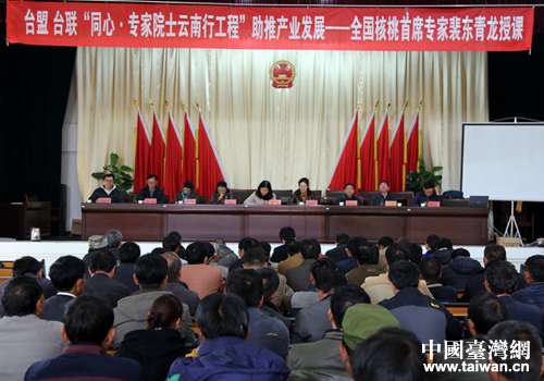 中國臺灣網(wǎng)11月30日華寧訊 11月28日,臺盟、臺聯(lián)“同心·專家院士云南行工程”在華寧縣青龍鎮(zhèn)舉辦核桃種植技術(shù)培訓(xùn)。臺盟云南省委主委、云南省臺聯(lián)會(huì)長楊曉紅,臺盟云南省委、云南省臺聯(lián)秘書長何原文,臺盟中央社會(huì)服務(wù)部扶貧工作處調(diào)研員劉曉英以及玉溪市委統(tǒng)戰(zhàn)部、華寧縣、青龍鎮(zhèn)有關(guān)領(lǐng)導(dǎo)出席培訓(xùn)班開班儀式。青龍鎮(zhèn)200余人參加培訓(xùn)。