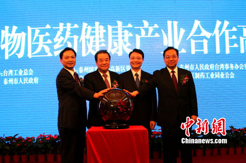 當(dāng)日,江蘇省副省長(zhǎng)何權(quán)、中共泰州市委書記張雷、泰州市代市長(zhǎng)徐郭平以及臺(tái)灣工業(yè)總會(huì)理事長(zhǎng)陳武雄共同為由臺(tái)灣工業(yè)總會(huì)和泰州醫(yī)藥高新區(qū)共同負(fù)責(zé)開發(fā)建設(shè)而設(shè)立的“海峽兩岸(泰州)生技產(chǎn)業(yè)園”揭牌。海峽兩岸生物醫(yī)藥健康領(lǐng)域的400多名精英出席并共同見證。