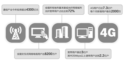 苗圩介紹說,今年,通信產(chǎn)業(yè)完成投資超過4300億元,全國所有地市基本建成光纖網(wǎng)絡(luò)城市,光纖寬帶用戶占比達(dá)到72%,4G用戶突破7億戶,全國IPTV(交互式網(wǎng)絡(luò)電視)用戶已達(dá)8200萬戶;全國固定寬帶平均接入速率達(dá)到2015年的2倍;新增3個(gè)互聯(lián)網(wǎng)骨干直連點(diǎn),網(wǎng)間帶寬新擴(kuò)容950G。