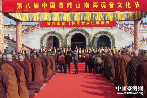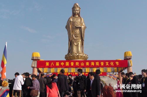 中國臺(tái)灣網(wǎng)11月5日舟山消息 今天上午,第八屆中國南海觀音文化節(jié)在浙江普陀山南海觀音大佛廣場(chǎng)隆重開幕。臺(tái)灣南鯤鯓代天府和臺(tái)灣靈鷲山等佛教交流團(tuán)共200余人應(yīng)邀參加文化節(jié)。