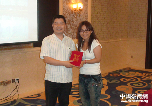 學(xué)生團(tuán)長胡佩君向人才中心江主任送紀(jì)念品。(圖片來源:舟山市臺辦)