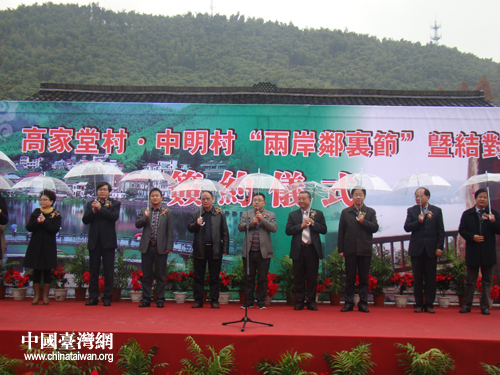 在高家堂村·中明村“兩岸鄰里節(jié)”暨結(jié)對簽約儀式上,湖州安吉縣山川鄉(xiāng)高家堂村村委會主任潘小眾說,因為臺灣中明村是鄉(xiāng)村旅游,現(xiàn)代農(nóng)業(yè)比較不錯的地方,我們想跟他們學(xué)習(xí)一下,借鑒一下,今后多交往多交流。臺灣南投縣魚池鄉(xiāng)中明村村長楊昆欣表示,以后要進(jìn)一步來互相互動,發(fā)展觀光和產(chǎn)業(yè)。儀式上,兩村簽訂了“締結(jié)友好村協(xié)議”和“婦女組織友好結(jié)對協(xié)議”。隨后舉行了座談會,兩村就相互情況進(jìn)行了交流。兩村村長也親手合力種下了“友好樹”。