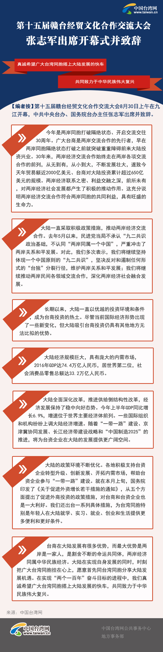 “江西逐漸成為臺(tái)商投資興業(yè)和承接?xùn)|部臺(tái)資企業(yè)轉(zhuǎn)移的新高地”——中共中央臺(tái)辦、國務(wù)院臺(tái)辦主任張志軍:2003年以來,在江西省委、省政府的高度重視下,贛臺(tái)會(huì)已成功舉辦了十四屆,達(dá)成了諸多兩地合作項(xiàng)目和共識(shí),成為大陸中部地區(qū)對(duì)臺(tái)經(jīng)貿(mào)文化交流合作的重要平臺(tái),為促進(jìn)兩岸經(jīng)濟(jì)社會(huì)發(fā)展、密切兩岸各界關(guān)系、增進(jìn)民眾福祉作出了積極貢獻(xiàn)。江西是“長珠閩”的直接腹地,處于國家“一帶一路”和長江經(jīng)濟(jì)帶戰(zhàn)略交匯點(diǎn),區(qū)位優(yōu)勢明顯、戰(zhàn)略平臺(tái)疊加、生態(tài)環(huán)境優(yōu)良,發(fā)展勢頭強(qiáng)勁。長期以來,江西省各級(jí)黨委、政府高度重視推動(dòng)贛臺(tái)交流合作,大力開展對(duì)臺(tái)招商引資,切實(shí)為臺(tái)商、臺(tái)企排憂解難,依法保護(hù)臺(tái)商投資權(quán)益,贏得臺(tái)商的廣泛信賴和贊譽(yù),江西也逐漸成為臺(tái)商投資興業(yè)和承接?xùn)|部臺(tái)資企業(yè)轉(zhuǎn)移的新高地。希望廣大臺(tái)商抓住中部崛起等重大戰(zhàn)略實(shí)施的機(jī)遇,積極參與大陸“一帶一路”、長江經(jīng)濟(jì)帶建設(shè),在合作雙贏中實(shí)現(xiàn)企業(yè)自身的發(fā)展壯大。中央臺(tái)辦、國務(wù)院臺(tái)辦將一如既往支持江西在深化兩岸交流合作中發(fā)揮更大的作用。