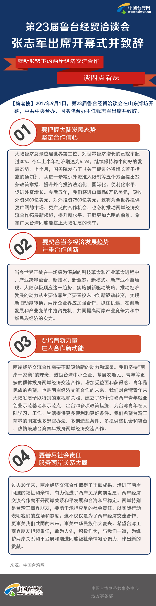 “希望廣大臺(tái)灣同胞能搭上大陸發(fā)展的快車”——中共中央臺(tái)辦、國務(wù)院臺(tái)辦主任張志軍:改革開放以來,山東經(jīng)濟(jì)社會(huì)快速健康發(fā)展。在大陸各省區(qū)市中,2016年山東省經(jīng)濟(jì)總量位居第三,超過6.7萬億元人民幣。山東基礎(chǔ)設(shè)施完善,產(chǎn)業(yè)門類齊全,發(fā)展?jié)摿薮,是大陸最具競爭活力的省份之一。山東與臺(tái)灣有著深厚的歷史淵源,山東籍的臺(tái)胞人數(shù)眾多,魯臺(tái)合作具有扎實(shí)的基礎(chǔ)。山東省委、省政府高度重視對(duì)臺(tái)交流合作。從上世紀(jì)九十年代初到現(xiàn)在,不管臺(tái)海形勢如何演變,每年堅(jiān)持舉辦魯臺(tái)經(jīng)貿(mào)交流治談會(huì),至今已是23屆,在大陸舉辦的涉臺(tái)經(jīng)貿(mào)活動(dòng)中創(chuàng)造了一個(gè)記錄。山東的這份堅(jiān)持和執(zhí)著,結(jié)出了魯臺(tái)合作的豐碩成果,也成為兩岸關(guān)系和平發(fā)展的縮影和寫照,展示出兩岸民間交流合作強(qiáng)大的生命力。希望魯臺(tái)會(huì)持續(xù)辦下去,越辦越好。中共中央臺(tái)辦、國務(wù)院臺(tái)辦將一如既往地支持魯臺(tái)不斷深化交流合作,并為此繼續(xù)作出努力。