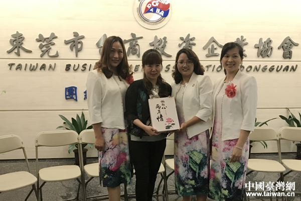 東莞市臺聯(lián)儷雅會創(chuàng)會會長陳超平(左二)向中華木蘭婦女交流協(xié)會理事長王秀惠(右二)致贈紀(jì)念品。(圖片來源:東莞市臺辦)