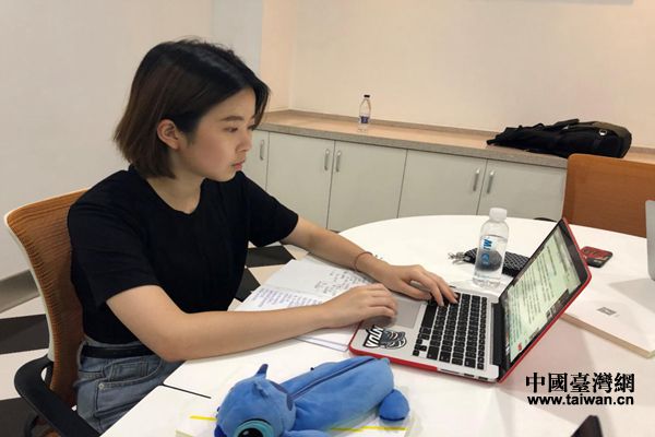 來自臺灣藝術(shù)大學(xué)的王心怡在構(gòu)思寫稿。(圖片來源:湖南省臺辦)