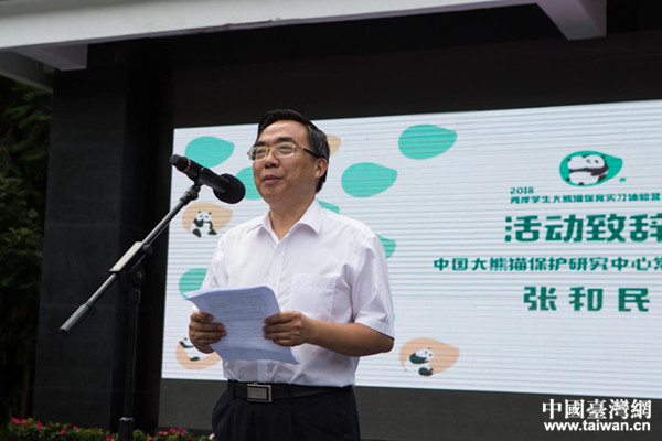 中國(guó)大熊貓保護(hù)研究中心主任張和民致辭。(圖片來源:四川省臺(tái)辦)