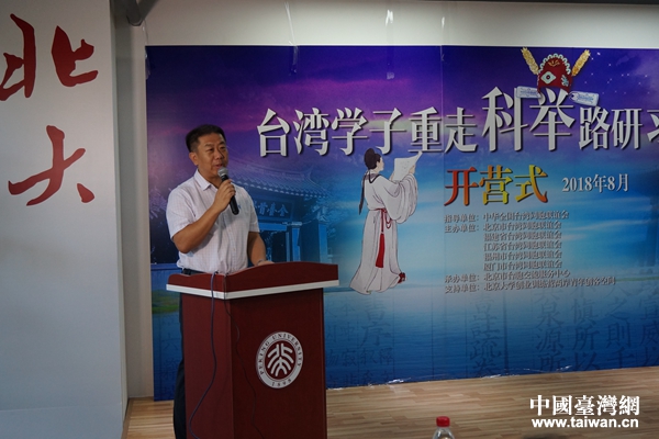 中國臺(tái)灣網(wǎng)8月21日廈門訊 8月20日下午,“臺(tái)灣學(xué)子重走科舉路研習(xí)營”在廈門北京大學(xué)創(chuàng)業(yè)訓(xùn)練營兩岸青年創(chuàng)客空間隆重開營。中華全國臺(tái)灣同胞聯(lián)誼會(huì)研究室主任陳立謙、北京市臺(tái)灣同胞聯(lián)誼會(huì)副會(huì)長王慧、北京市臺(tái)灣同胞聯(lián)誼會(huì)名譽(yù)會(huì)長盧咸池、福建省臺(tái)灣同胞聯(lián)誼會(huì)副會(huì)長蘇甦、福州市臺(tái)灣同胞聯(lián)誼會(huì)副調(diào)研員許峰、臺(tái)灣華梵大學(xué)前校長高柏園、臺(tái)灣銘傳大學(xué)廣播電視學(xué)系主任杜圣聰?shù)瘸鱿_營式。曾舉辦過“科舉制度在臺(tái)灣”高校巡展的臺(tái)灣華梵大學(xué)、銘傳大學(xué)師生和在京青年臺(tái)胞大學(xué)生組成的研習(xí)營及相關(guān)單位嘉賓50余人參加了開營式。