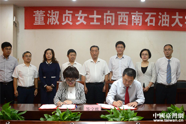 董淑貞與西南石油大學(xué)簽訂捐贈(zèng)協(xié)議。(圖片來源:四川省臺聯(lián))