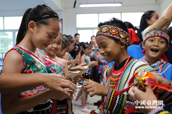 大新縣雷平鎮(zhèn)中心小學(xué)與臺(tái)灣花蓮太平小學(xué)交換禮品。(圖片來源:廣西臺(tái)辦)