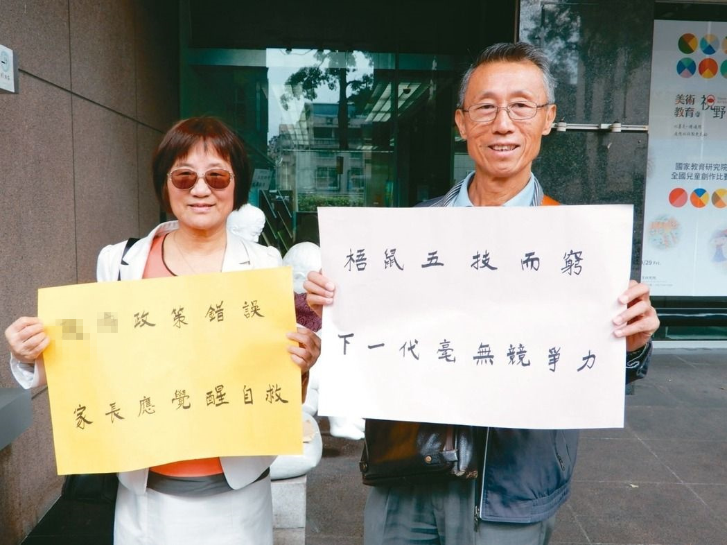臺灣退休老師手拿標(biāo)語抗議,指刪減文言文比率是教育自宮、自殘。 (圖片來源:臺灣《聯(lián)合報》)