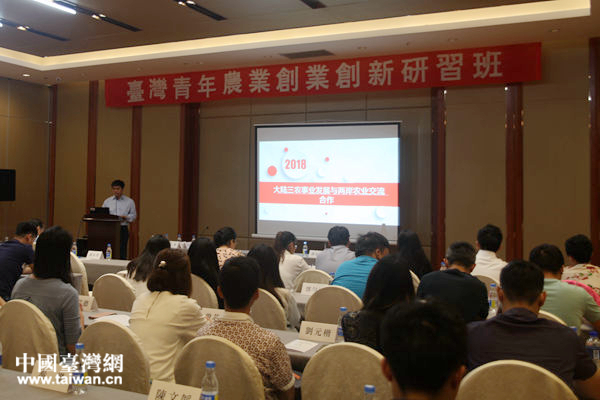 中國臺(tái)灣網(wǎng)7月21日哈爾濱訊 (記者 陳文韜)“農(nóng)業(yè)是兩岸交流的先行者,是兩岸交流與合作中起步最早、基礎(chǔ)最好、成效最為顯著的領(lǐng)域。經(jīng)過30年發(fā)展,兩岸農(nóng)業(yè)已經(jīng)成為全方位、寬領(lǐng)域、多層次的交流與合作格局!7月21日上午,2018年臺(tái)灣青年農(nóng)業(yè)創(chuàng)業(yè)創(chuàng)新研習(xí)班在“冰城”哈爾濱開班,農(nóng)業(yè)農(nóng)村部對(duì)臺(tái)灣農(nóng)業(yè)事務(wù)辦公室調(diào)研員楊慧軍正在向研習(xí)班的臺(tái)灣青年們介紹兩岸農(nóng)業(yè)合作交流情況。
