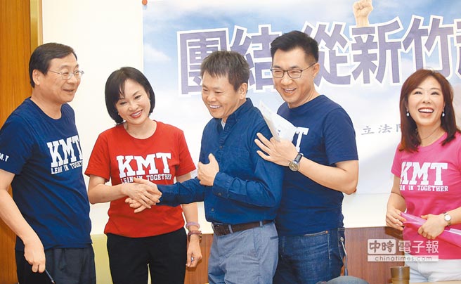 國(guó)民黨“立委”林為洲(中)29日宣布退選新竹縣長(zhǎng),國(guó)民黨“立法院”黨團(tuán)總召江啟臣(右二)與同黨“立委”曾銘宗(左起)、柯志恩、李彥秀等人都出席為林為洲加油打氣。(圖片來源:臺(tái)灣“中時(shí)電子報(bào)”)