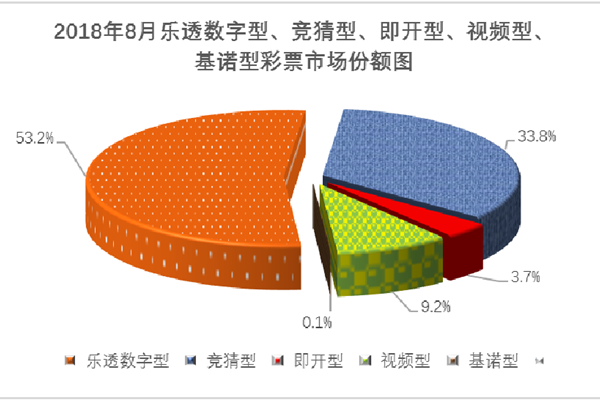 從彩票類型看,8月份,樂透數(shù)字型彩票銷售222.32億元,同比增加11.03億元,增長5.2%;競猜型彩票銷售141.48億元,同比增加57.43億元,增長68.3%;即開型彩票銷售15.64億元,同比減少1.66億元,下降9.6%;視頻型彩票銷售38.56億元,同比增加0.69億元,增長1.8%;基諾型彩票銷售0.16億元,同比減少0.01億元,下降1.2%。8月份,樂透數(shù)字型、競猜型、即開型、視頻型、基諾型彩票銷售量分別占彩票銷售總量的53.2%、33.8%、3.7%、9.2%、0.1%。