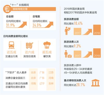 中國銀聯(lián)8日發(fā)布2018年國慶黃金周銀聯(lián)網(wǎng)絡(luò)交易數(shù)據(jù)!笆弧遍L假期間,銀聯(lián)網(wǎng)絡(luò)交易總金額達(dá)到1.58萬億元,交易總筆數(shù)7.94億筆,日均較去年國慶黃金周分別增長31.9%和24.5%。今年國慶7天的銀行卡跨行交易規(guī)模超過去年國慶黃金周8天的總量,創(chuàng)國慶長假歷史新高。