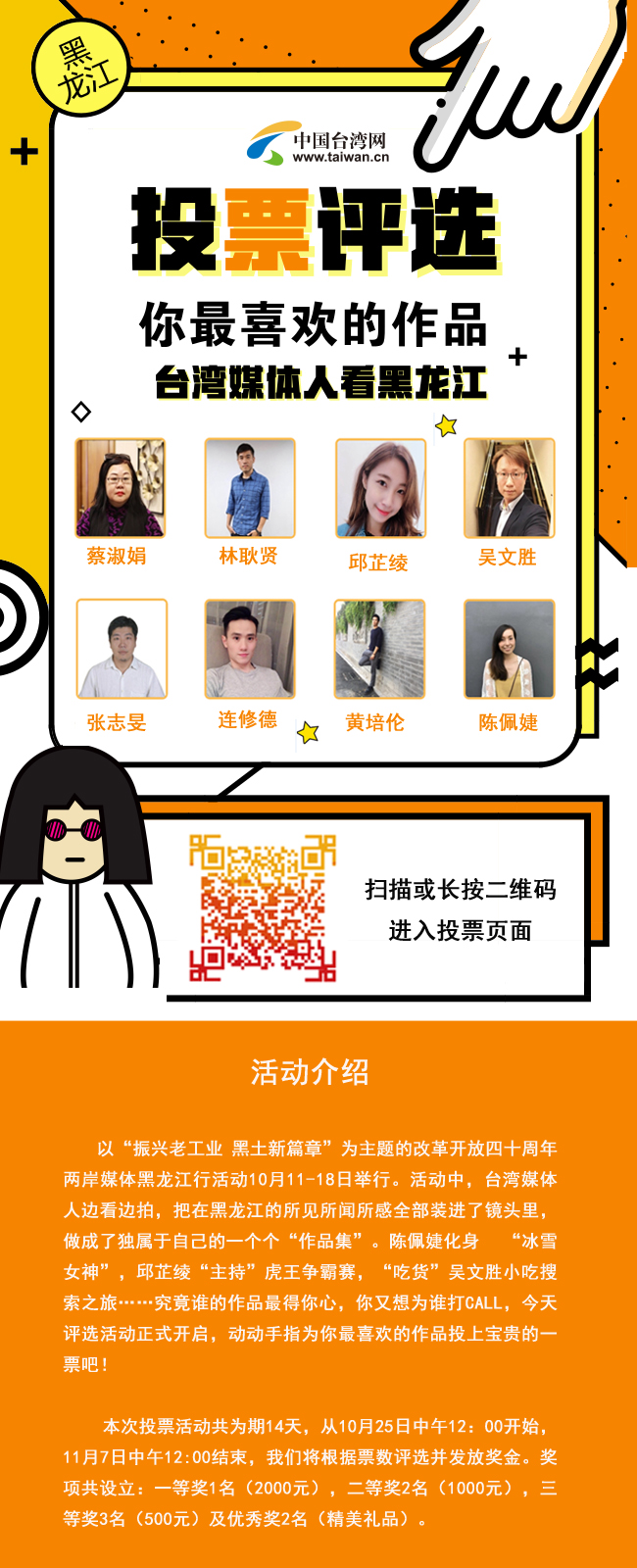 活動(dòng)中,臺(tái)灣媒體人邊看邊拍,把在黑龍江的所見所聞所感全部裝進(jìn)了鏡頭里,做成了獨(dú)屬于自己的一個(gè)個(gè)“作品集”。臺(tái)灣自媒體人陳佩婕化身“冰雪女神”,邱芷綾“主持”虎王爭(zhēng)霸賽,“吃貨”吳文勝小吃搜索之旅……究竟誰的作品最得你心,你又想為誰打CALL,今天評(píng)選活動(dòng)正式開啟,動(dòng)動(dòng)手指為你最喜歡的作品投上寶貴的一票吧!