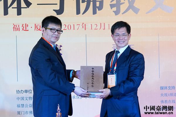 九州音像出版公司副總裁冀小東先生為中華慈濟(jì)大學(xué)贈《中化佛教文化年鑒》。(中國臺灣網(wǎng) 張玲 攝)