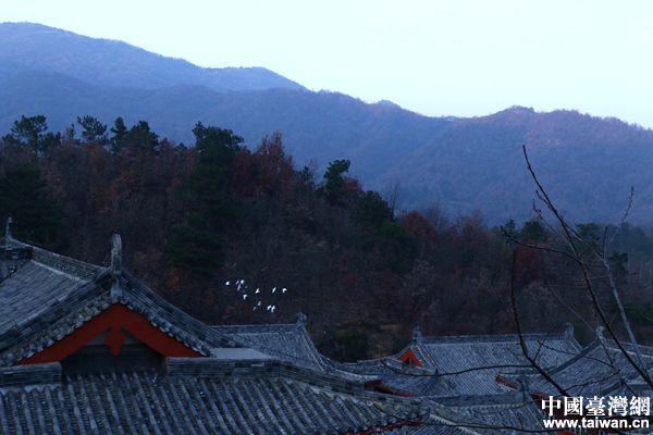 兩岸人士參觀佛教學院,學院巖壁上成群白鴿飛過。(中國臺灣網(wǎng) 盧佳靜 攝)
