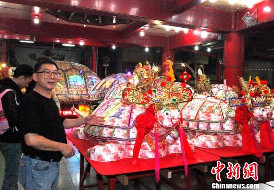 24日晚,高雄地標建筑八五大樓旁的意誠堂關帝廟,民眾云集周邊街區(qū)。傳統(tǒng)陣頭開道,藝術團舞蹈及社區(qū)的民俗表演,共迎“電動祈福吉祥平安大龜王”進場,為“乞龜祈福拉龜王保平安觀光節(jié)”揭開序幕。當天適逢農歷初九天公生,現(xiàn)場民眾扶老攜幼拜天公、鉆轎腳賜福,領取福氣小龜?shù)躏椇湾X母,不亦樂乎。當?shù)毓賳T也應景到場派發(fā)鴻運大紅包,肯定廟方善舉。