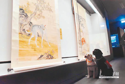 臺北故宮南院特展“戊戌狗年·喜迎上元”開展記者會上,導盲犬與郎世寧《十駿犬》真犬、畫犬相見歡。 呂妍庭攝(臺灣《中國時報》供圖)