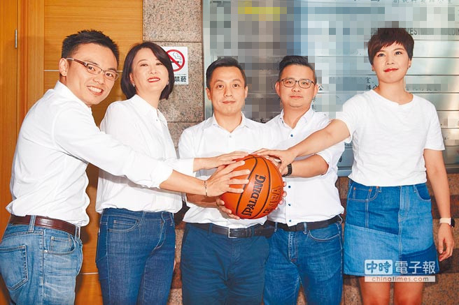 國(guó)民黨發(fā)言人1日亮相,文傳會(huì)義務(wù)副主委洪孟楷(左起)、臺(tái)北市議員王鴻薇、文傳會(huì)主委李明賢、新媒體部主任黃健豪、新任文傳會(huì)副主委兼文宣部主任鐘沛君共同拿籃球,高喊“重返執(zhí)政,國(guó)民黨加油”,希望2018地方選舉投“藍(lán)”成功。(圖片來(lái)源:臺(tái)灣《中時(shí)電子報(bào)》)