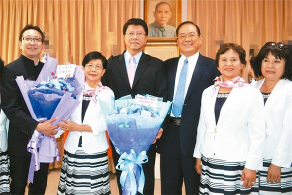 國(guó)民黨臺(tái)南市黨部舉行新舊任主委交接典禮,黨員獻(xiàn)花祝福新主委謝龍介(右四)。(圖片來(lái)源:臺(tái)灣《聯(lián)合報(bào)》)