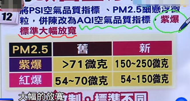 雖然“環(huán)保署長”煞有其事的立下了“軍令狀”,但其實人家早已將標準調整了:原本空氣質量指針(AQI)超過70毫克就是“紫爆”,但修改過后標準變成超過150毫克才是“紫爆”,“紅爆”也從70微克的上限放寬到了150微克。如此看來,臺中市“紫爆”天數從去年的99天變成了今年的19天,還真是不奇怪了。有臺媒調侃到:就算明年不幸險些就要超過20%了,那再下調標準不就好了;還諷刺說“環(huán)保署長”應該在一開始時就稱要調降50%的目標,這樣會更感人。