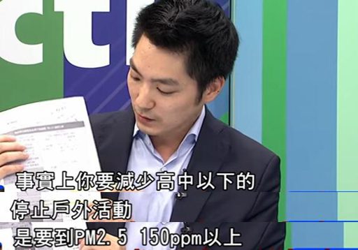 對此,國民黨“立委”蔣萬安也向“環(huán)保署長”提出質疑,但得到的卻是對方自相矛盾的說法,“我問他,就前兩天的情況看,你會不會鼓勵民眾減少外出?他說當然會。然而實際上環(huán)保部門定的管制措施上卻規(guī)定,要減少高中以下的戶外活動,PM2.5是要到150ppm以上才可以。也就是說,要達到修改后的空污‘紫爆’標準才可以,這根本是自相矛盾”。
