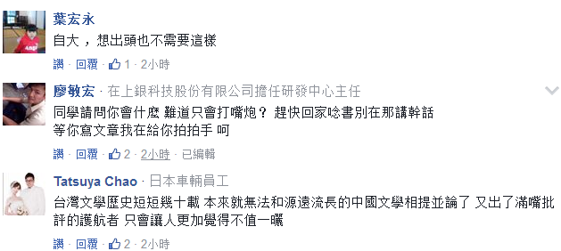 有網(wǎng)友表示:“好了乖孩子,別在這兒秀下限了!你有言論自由我不否認,但肚里沒什么墨水,卻要硬擠出腐水,那就不好了。建議你先去學(xué)好歷史,了解何謂歷史,了解何謂歷史脈絡(luò),看你的言論就能知道臺灣壓根不重視歷史教育!對了,你也不懂文學(xué)!