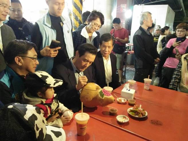 馬英九跨年夜到六合夜巿喝木瓜牛奶,并為民眾簽名。(圖片來源:臺(tái)灣《中時(shí)電子報(bào)》)