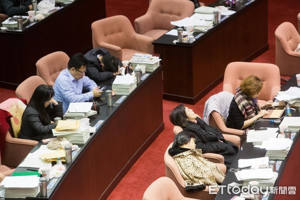 臺灣“立法院”針對“勞基法”修訂進(jìn)入凌晨,臺下多名“立委”已經(jīng)睡著,形成過勞修“勞基法”的現(xiàn)象。(圖片來源:臺灣《中時(shí)電子報(bào)》)