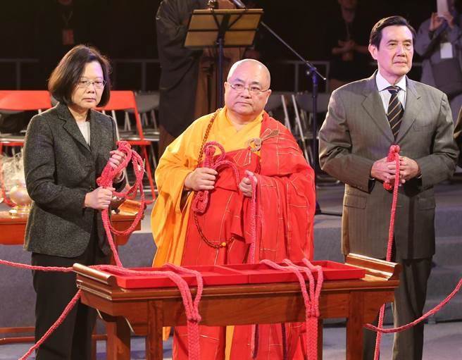 馬英九蔡英文同臺(tái)敲鐘祈福。(圖片來源:臺(tái)灣《中時(shí)電子報(bào)》)