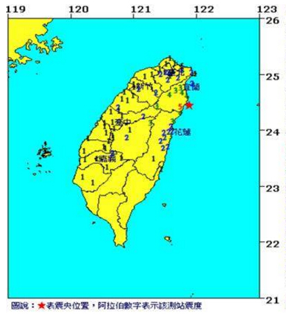 據(jù)報(bào)道,根據(jù)“氣象局地震測報(bào)中心”資料,各地最大震度宜蘭縣南澳5級、花蓮縣和平4級,3級地區(qū)包括:宜蘭縣宜蘭市、南投縣合歡山;2級地區(qū)有:新北市坪林、花蓮縣花蓮市、桃園市三光、臺北市信義區(qū)、臺北市、新北市、臺中市德基、新竹縣竹東、苗栗縣三義、云林縣草嶺;1級地區(qū)有:基隆市、桃園市、新北市萬里、新竹市、新北市石門、新竹縣竹北市、苗栗縣苗栗市、臺中市、南投縣南投市、彰化縣彰化市、嘉義縣阿里山、云林縣斗六市、嘉義市、臺東縣長濱、臺南市新化。