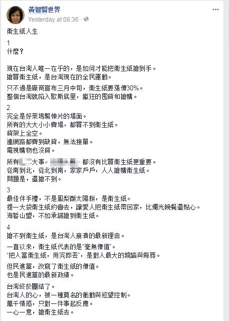臺灣政論節(jié)目主持人黃智賢則發(fā)文說,所有大事,都沒有比買衛(wèi)生紙更重要,而“搶不到衛(wèi)生紙,是臺灣人崩潰的最新理由”;更嘲諷道,一直以來衛(wèi)生紙代表的是“毫無價值”,但民進黨改寫了衛(wèi)生紙的價值,這“也是民進黨的最新政績”了。