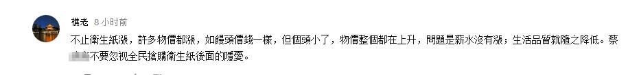還有人抱怨,其實不止衛(wèi)生紙,如今臺灣物價已經(jīng)全面上漲了,很多民生消費品也包括其中,但與大幅上漲的物價相比,偏偏薪資沒漲(漲了也跟沒漲一樣)……